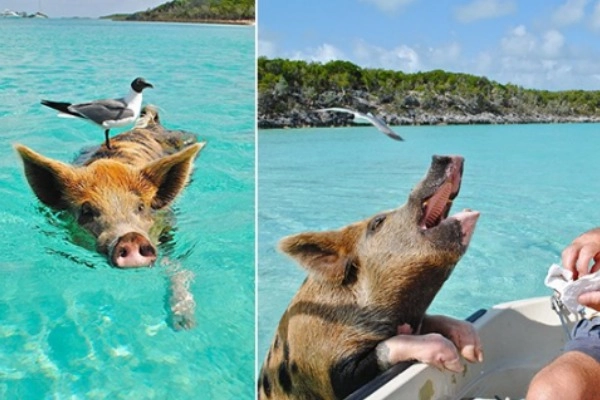 No one lives here permanently, but it’s famous as Pig Beach—all thanks to the swimming pigs that call this spot home.